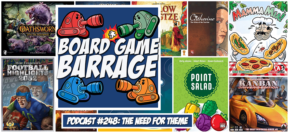 The topic of theme has come up intermittently over the course of the podcast, but how important is it? Is it something that makes or breaks a game? Or would we be mostly okay if games were mostly non-thematic? Before we burst at the theme, we talk about Mamma Mia!, Football Highlights 2052, Kanban, and Oathsworn: Into the Deepwood.